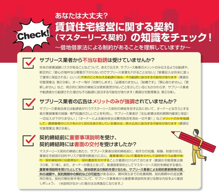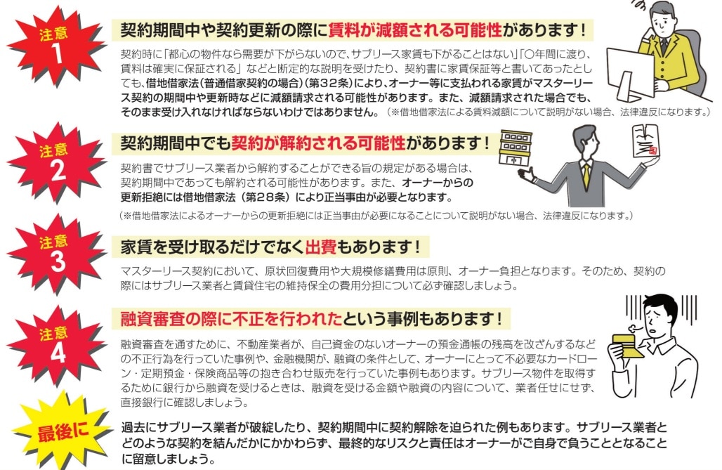 国土交通省 賃貸住宅経営(サブリース方式)の注意管理リーフレットより、契約時の注意点