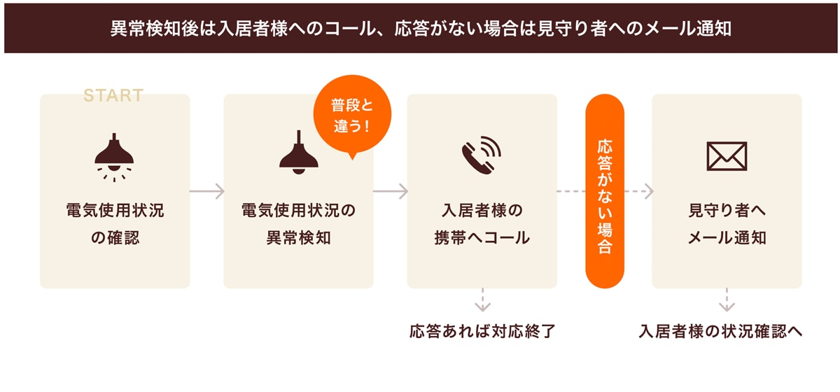 入居者様の見守りを開始、異常検知時は入居者様に安否確認のお電話が入ります。応答がない場合は見守り者様にメールで通知が届きます。